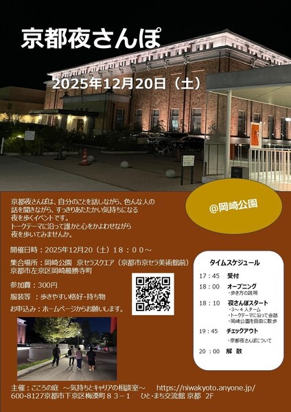 12月20日(土)に京都市で夜さんぽが開催されます。主催者の方は何度も夜さんぽへご参加くださり、私たちも資料等の提供を通じて開催に協力をしています。よかったらご参加くださいね