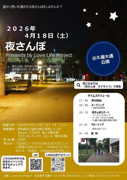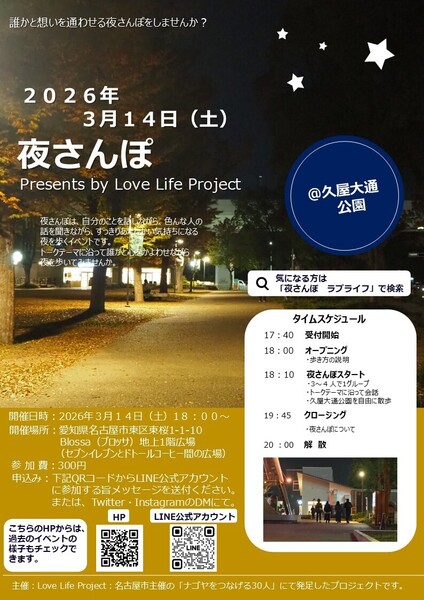 Love Life Project は、誰もが生きることを自然に愛せる社会の実現を目指し、自分のことを話しながら、色んな人の話を聞きながら、すっきりあたたかい気持ちになる夜を歩くイベント「夜さんぽ」を2021年春から月に1回ほどのペースで開催しています。